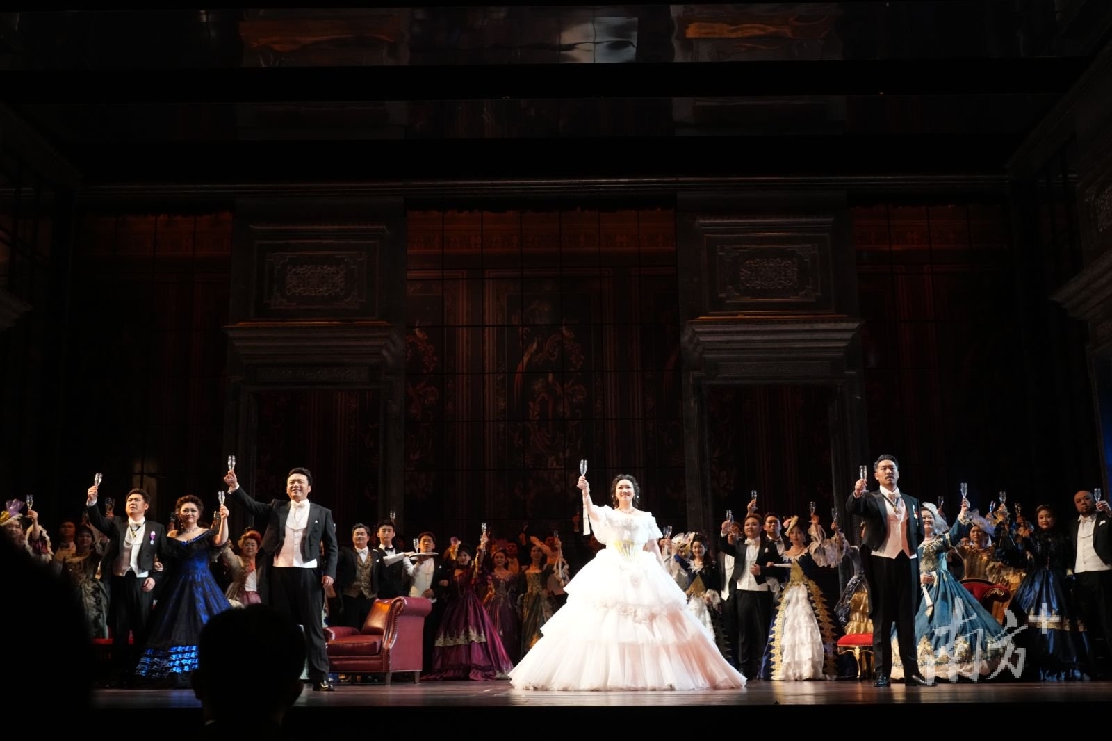 开幕演出《茶花女》由郑州大学河南音乐学院出品,由世界著名歌唱家戴玉强担任艺术总监,由优秀青年艺术家戴梓伊、张龙等领衔主演。该版本在威尔第原剧基础上融入了本土艺术元素,在舞台设计方面亦别具匠心——镜面、投影与象征性的茶花树彼此呼应,既还原十九世纪巴黎风情,又传递东方美学中“虚静”的哲学理念。该剧剧本在忠实于原著的基础上,通过强化女性自主意识,为经典题材注入现代解读,成为中外文化交流互鉴的一次生动实践。据了解,此次郑州大学河南音乐学院排演的《茶花女》,剧组人员都是“90后”,从指挥到大部分乐队的老师,加上我们台上所有的角色演员,全部都是“90后”的青年音乐家。合唱团也是河南大学音乐学院的在读学生,其中不少为00后或者10后。这些年轻的音乐演员们努力把他们所理解这部世界上演率最高的歌剧之一《茶花女》,带给观众不一样的理解和体验。